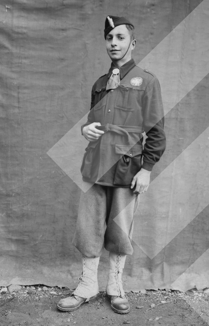 Vani Burda, rreth 1939-1942, Djalosh me uniformën e rinisë fashiste, negativ në letër, 9 x 14 cm.