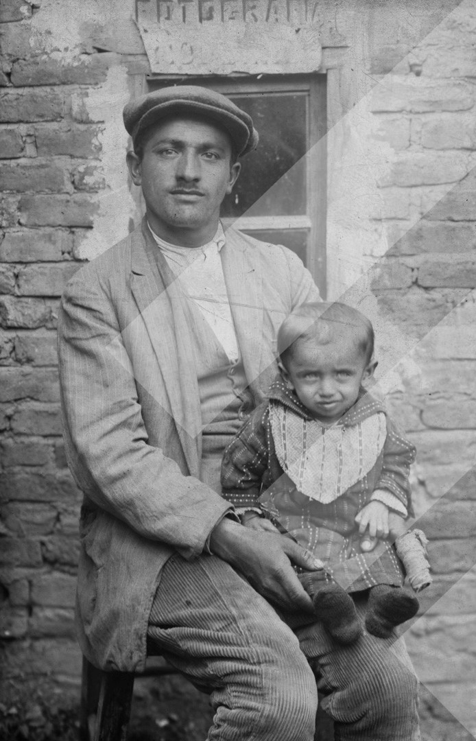 Vani Burda, rreth 1935-1940, At e bijë në pozë para studios së fotografit, negativ në letër, 9 x 14 cm.
