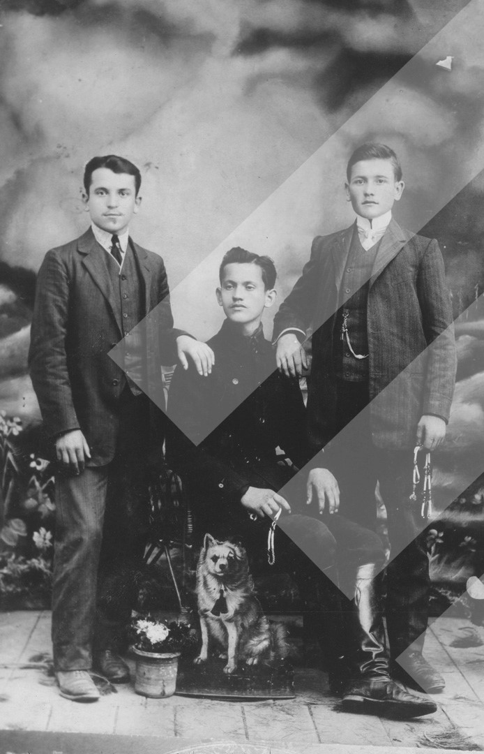 Vani Burda, rreth 1935-1940, Spirro Ballkameni me dy shokë, negativ në letër i rifotografuar, 9 x 14 cm.