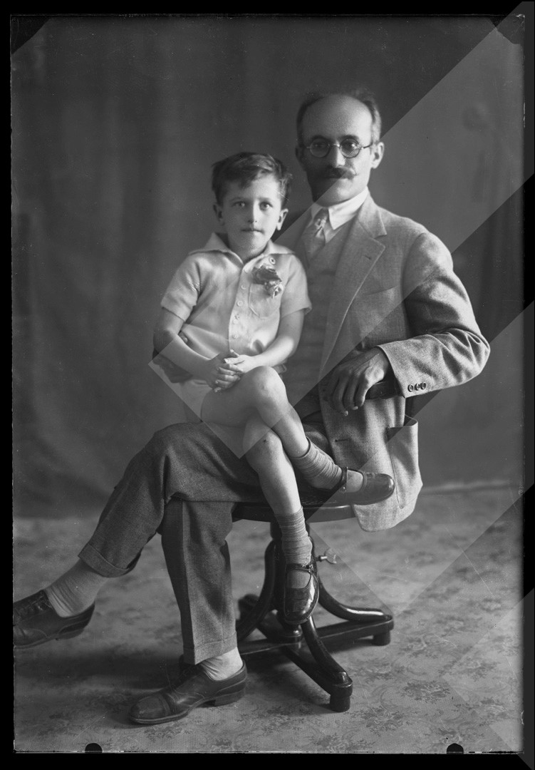 Ath. Nikolakopulos, rreth 1920-1925, Zotëri korçar me të birin, pllakë xhami, 13 x 9 cm.