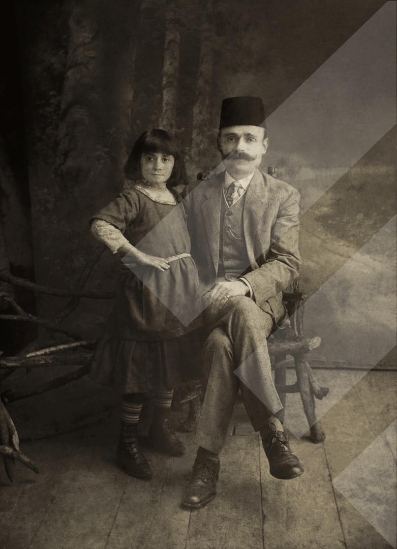 Ath. Nikolakopulos, rreth 1905-1910, Zotëri korçar me të bijën, print në letër, 16 x 12 cm.