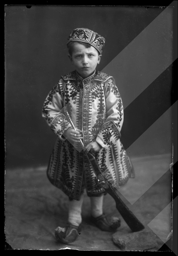 Ath. Nikolakopulos, rreth 1920-1925, Fëmijë me petka tradicionale, Korçë, pllakë xhami, 13 x 9 cm.