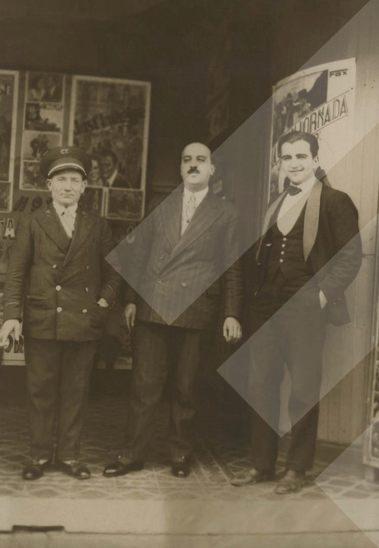 I panjohur, 1931, Vasil Ristani (djathtas) para kinemasë ku punonte, me dy kolegë. Buenos Aires, print në letër, 8 x 12 cm.