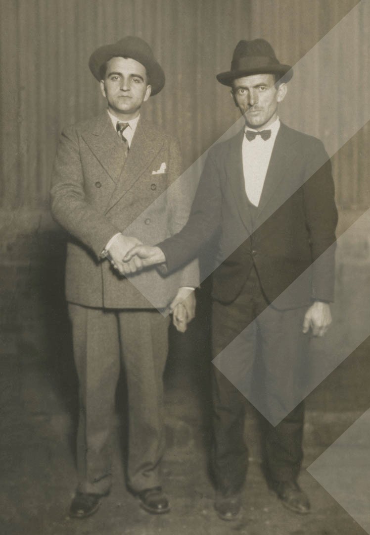 I panjohur, rreth 1929-1931, Vasil Ristani (majtas) në pozë me një mik. Buenos Aires, print në letër, 8 x 12 cm.