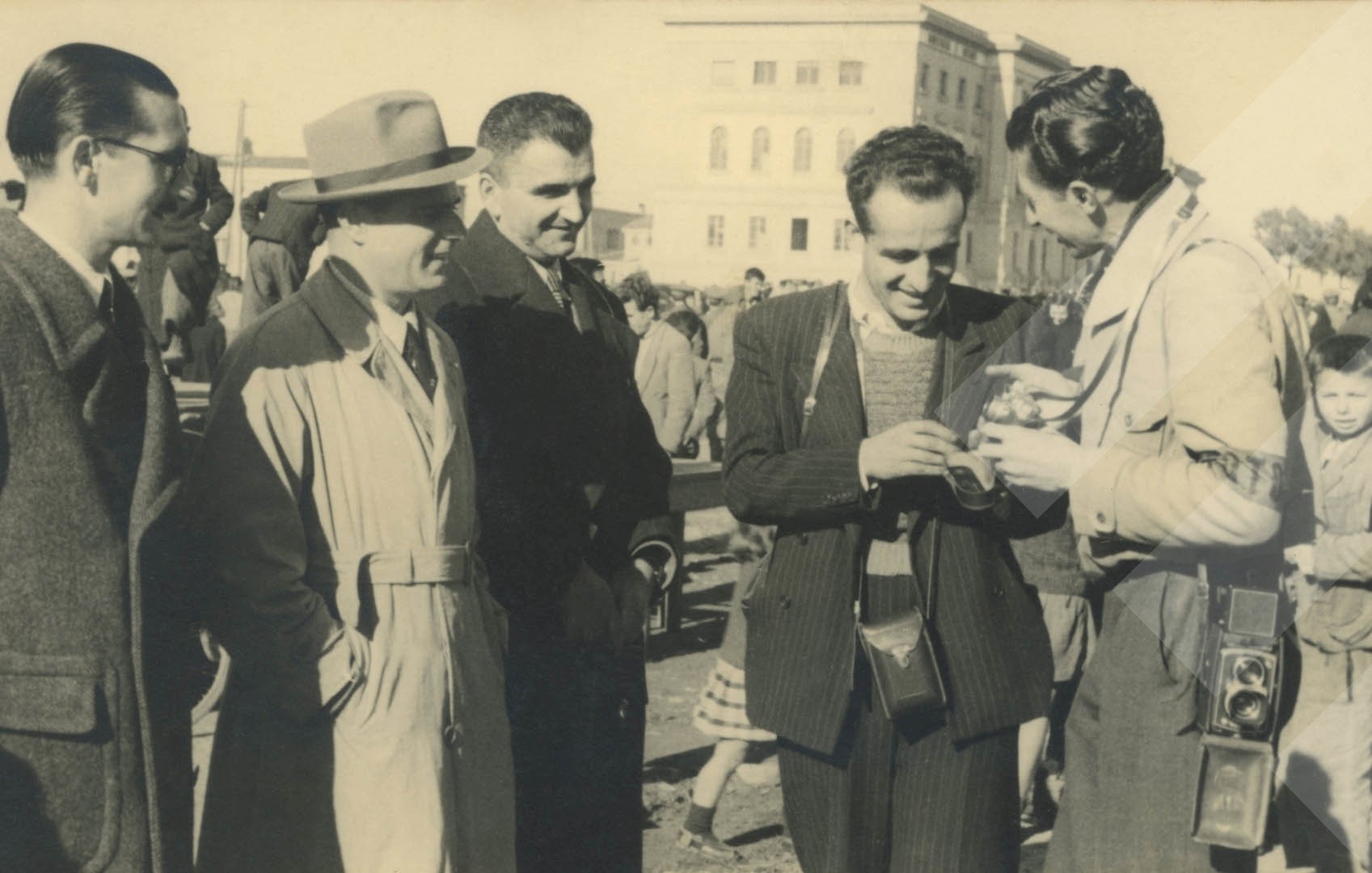 I panjohur, rreth 1948-1950, Bisedë mes fotografësh pas dokumentimit të një aktiviteti. Tiranë, print në letër, 7 x 11 cm.