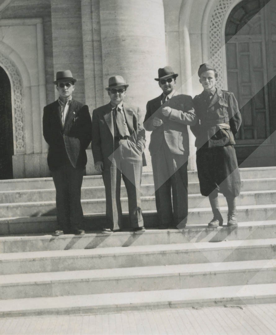 I panjohur, rreth 1940, Para Kishës Katolike në Tiranë (Vasil Ristani i dyti nga e dhjathta), print në letër, 6 x 7 cm.