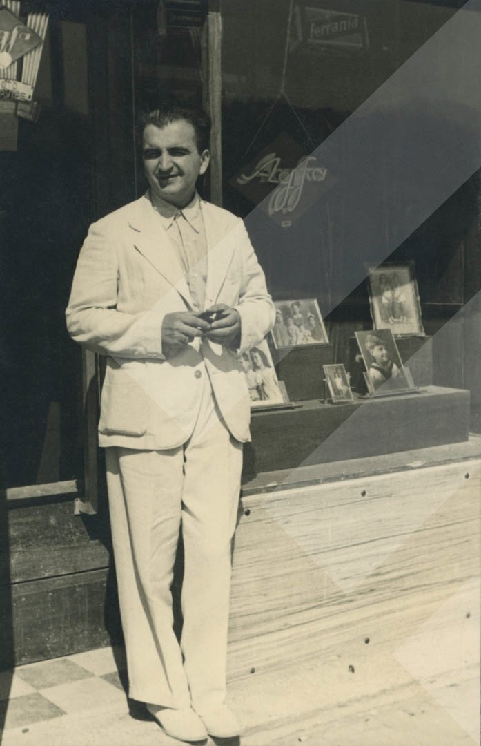 Jani Ristani, 1938, Vasil Ristani para studios së tij. Tiranë, print në letër, 7 x 12 cm.