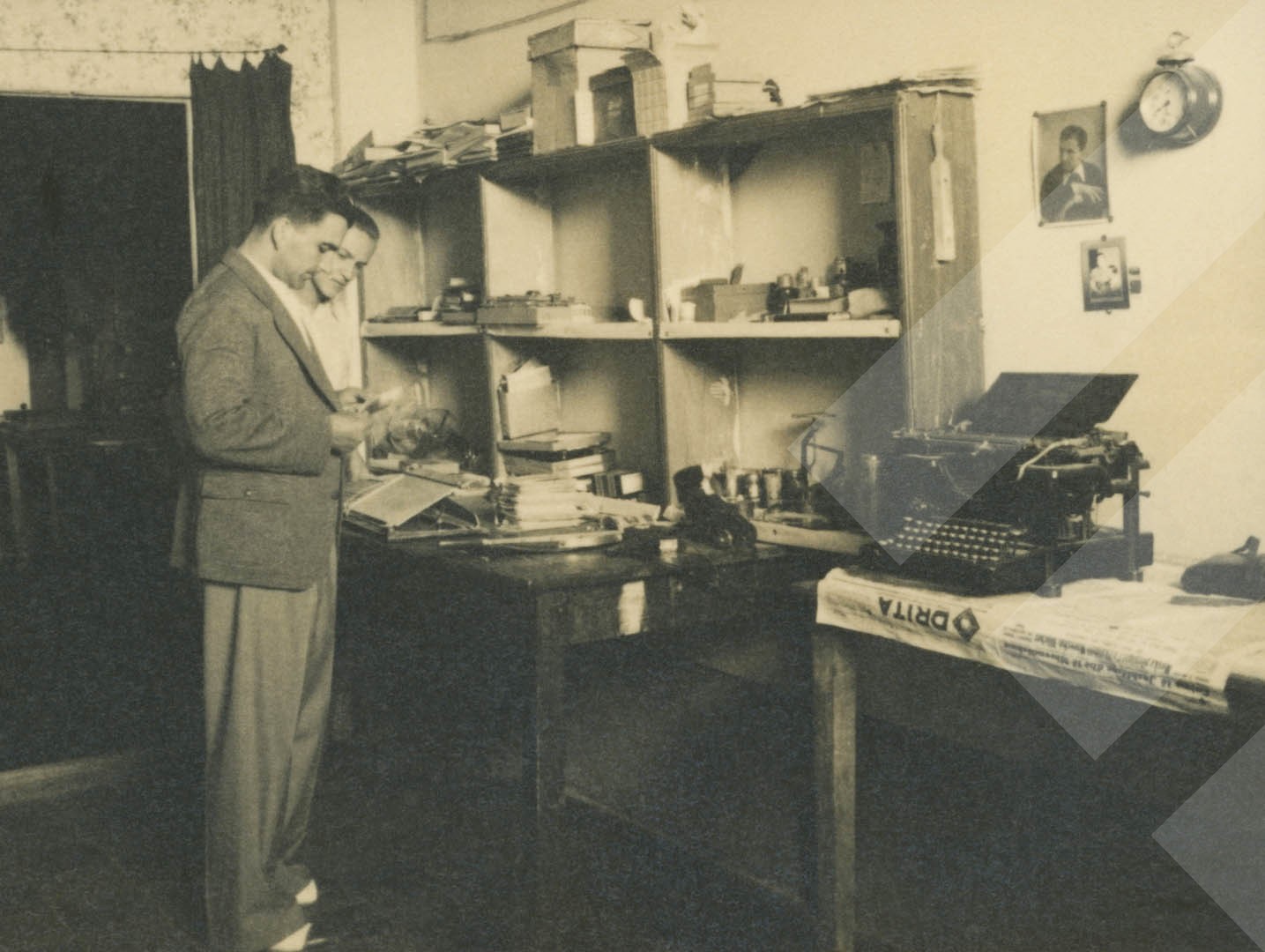 Studio Ristani, rreth 1938, Vasil Ristani me Filip Viton në mjediset e studios, print në letër, 7 x 9 cm.