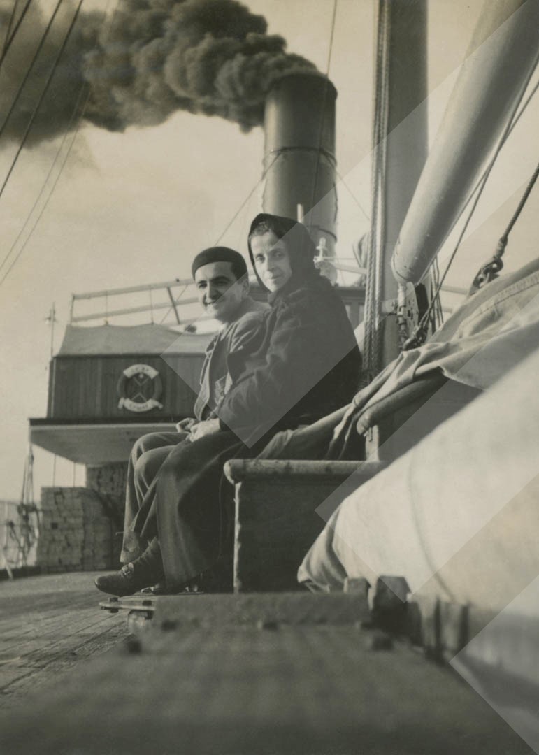 Vasil Ristani, 1940, Bashkëshortët Ristani në anije, print në letër, 5 x 7 cm.