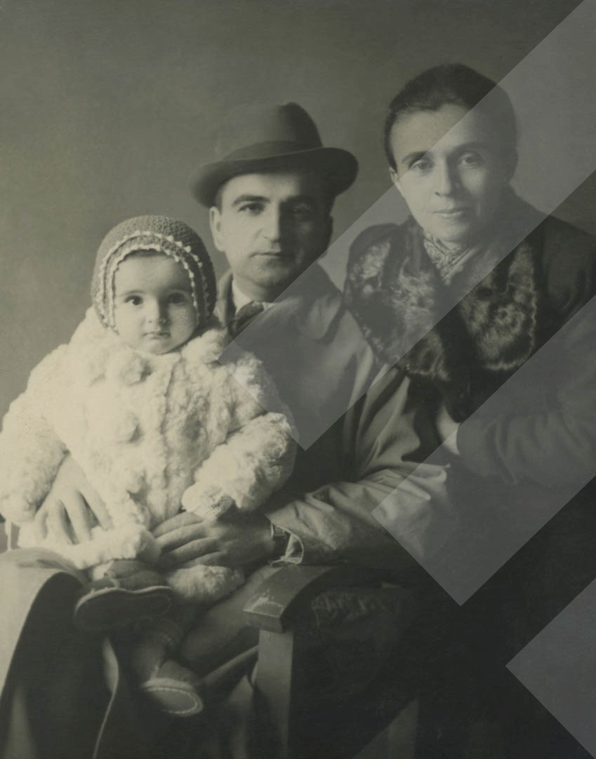 Vasil Ristani, 1942, Bashkëshortët Ristani me djalin e tyre Petrit, print në letër, 11 x 14 cm.