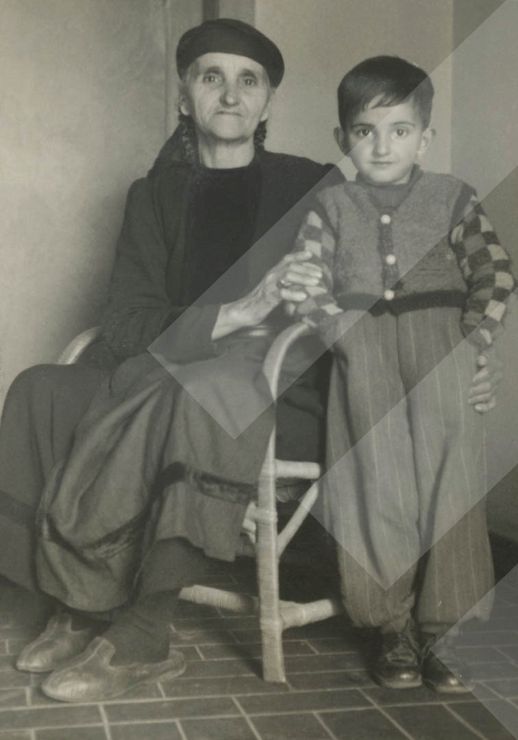 Vasil Ristani, rreth 1947, Petrit Ristani me gjyshen, print në letër, 7 x 10 cm.