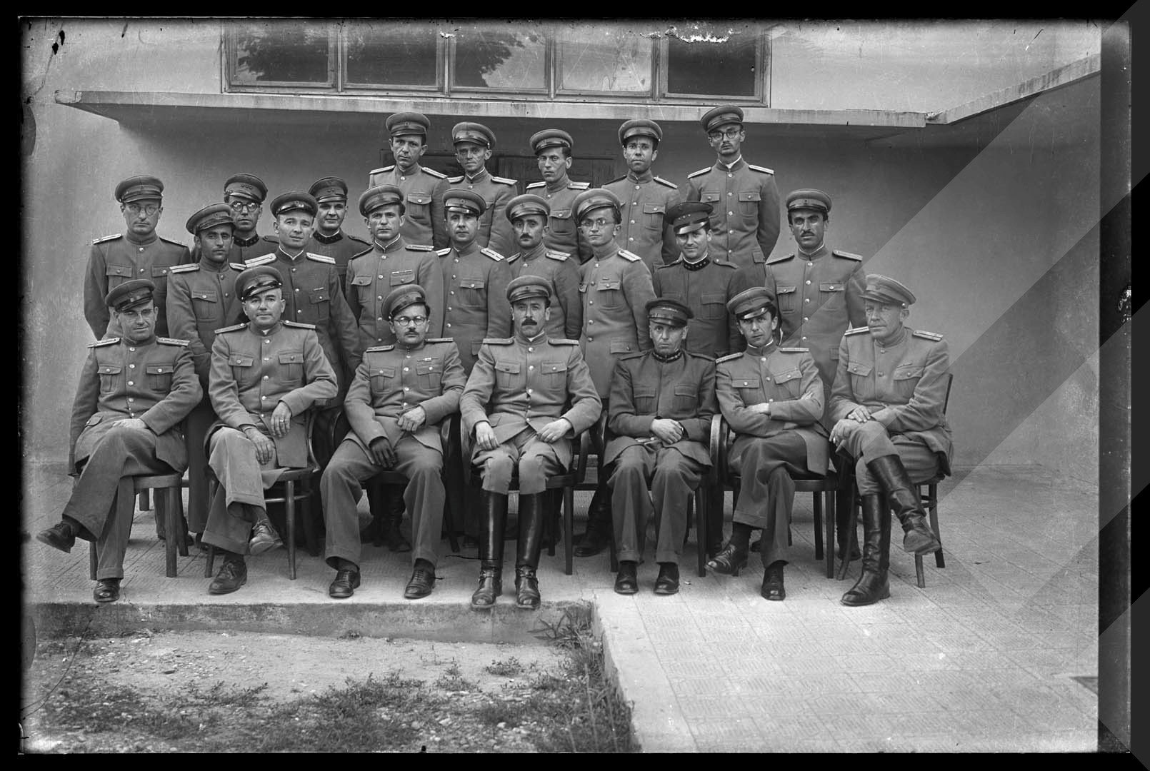 Vasil Ristani, rreth 1948-1949, Stafi i Spitalit Ushtarak, Tiranë (në qëndër drejtori Major Sinan Imami), pllakë xhami, 10 x 15 cm.