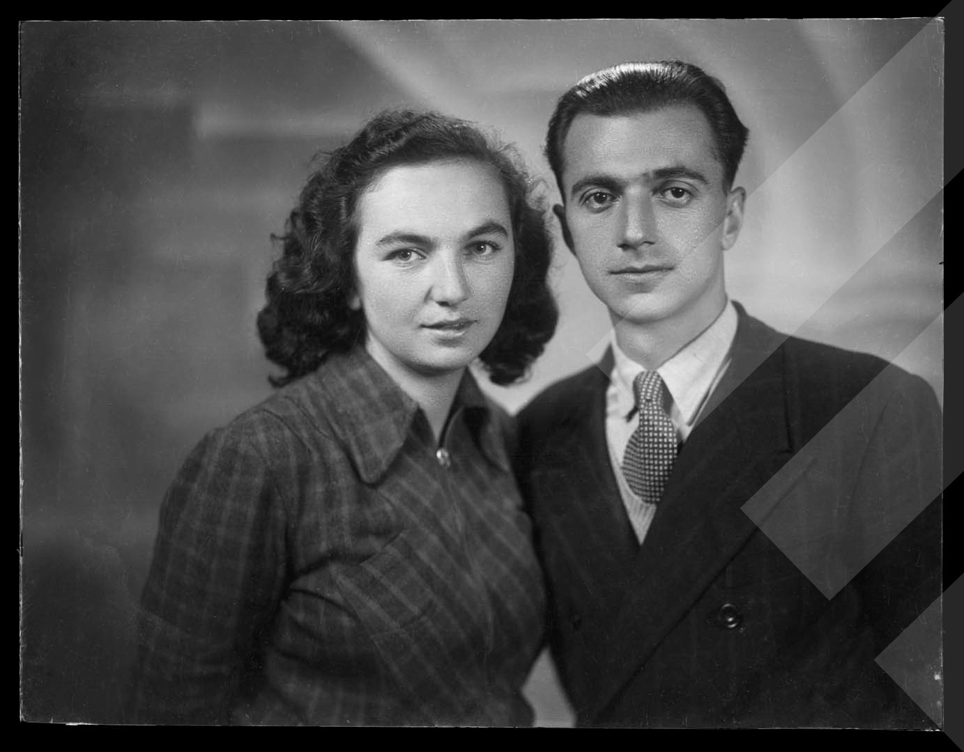 Vasil Ristani, rreth 1946-1947, Bashkëshortët Manush dhe Nefo Myftiu, pllakë xhami, 10 x 13 cm.