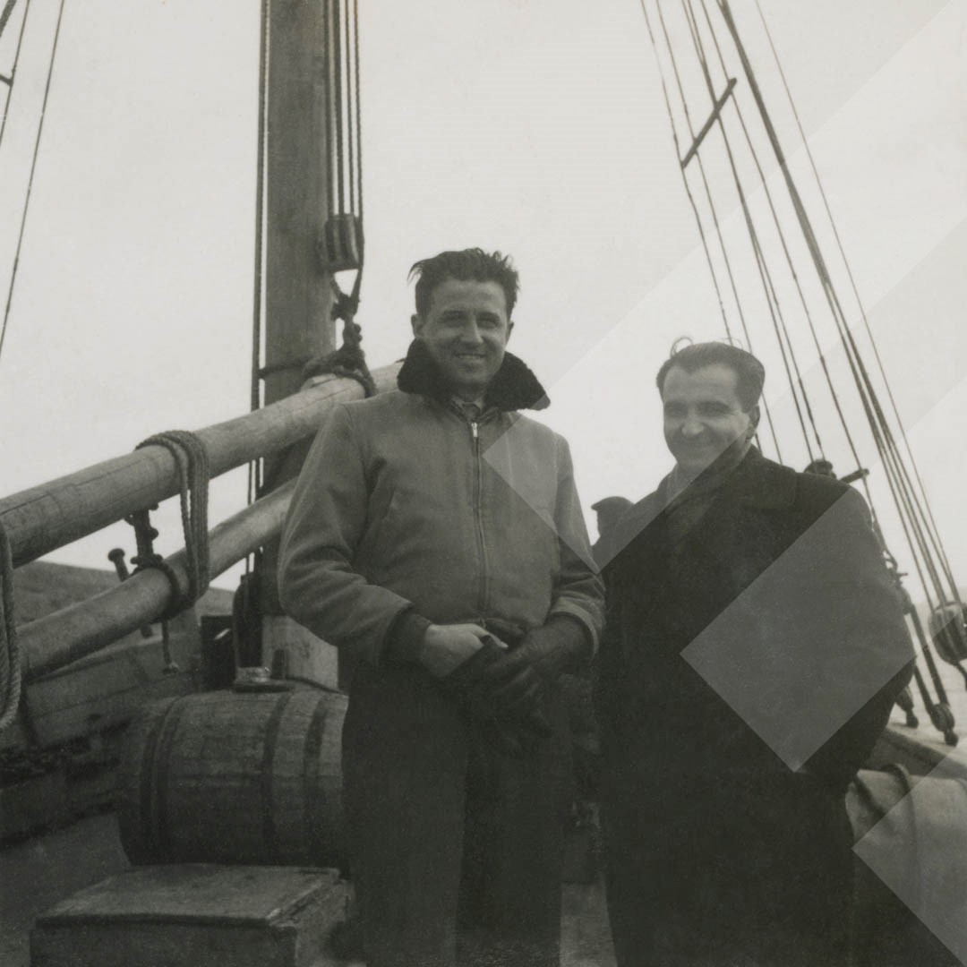 Vasil Ristani, 1946, Vasil Ristani në bordin e një anije gjatë dokumentimit të "Incidentit të kanalit të Korfuzit", print në letër, 6 x 6 cm.