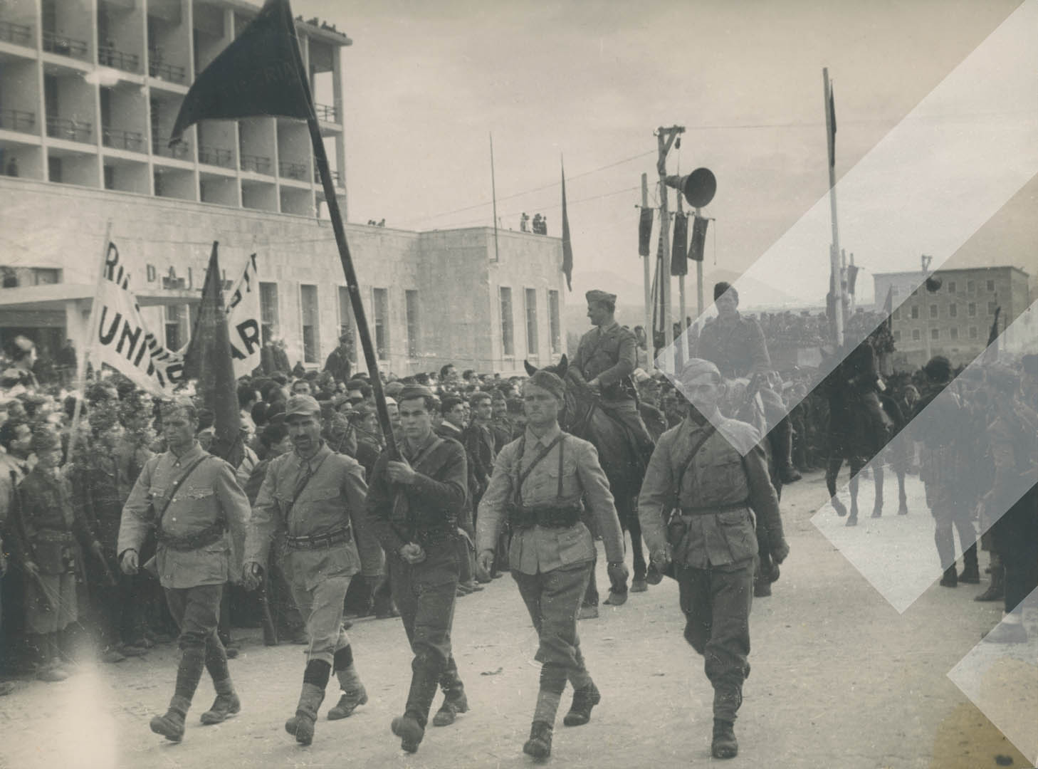 Vasil Ristani, 1944, Parakalim partizan në Tiranë, 28 nëntor 1944, print në letër, 20 x 27 cm,.
