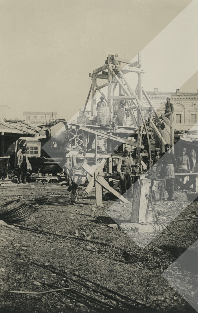 Otello Renzoni, 1929, Punimet nga ndërtimi i portit të Durrësit, print në letër, 14 x 9 cm.