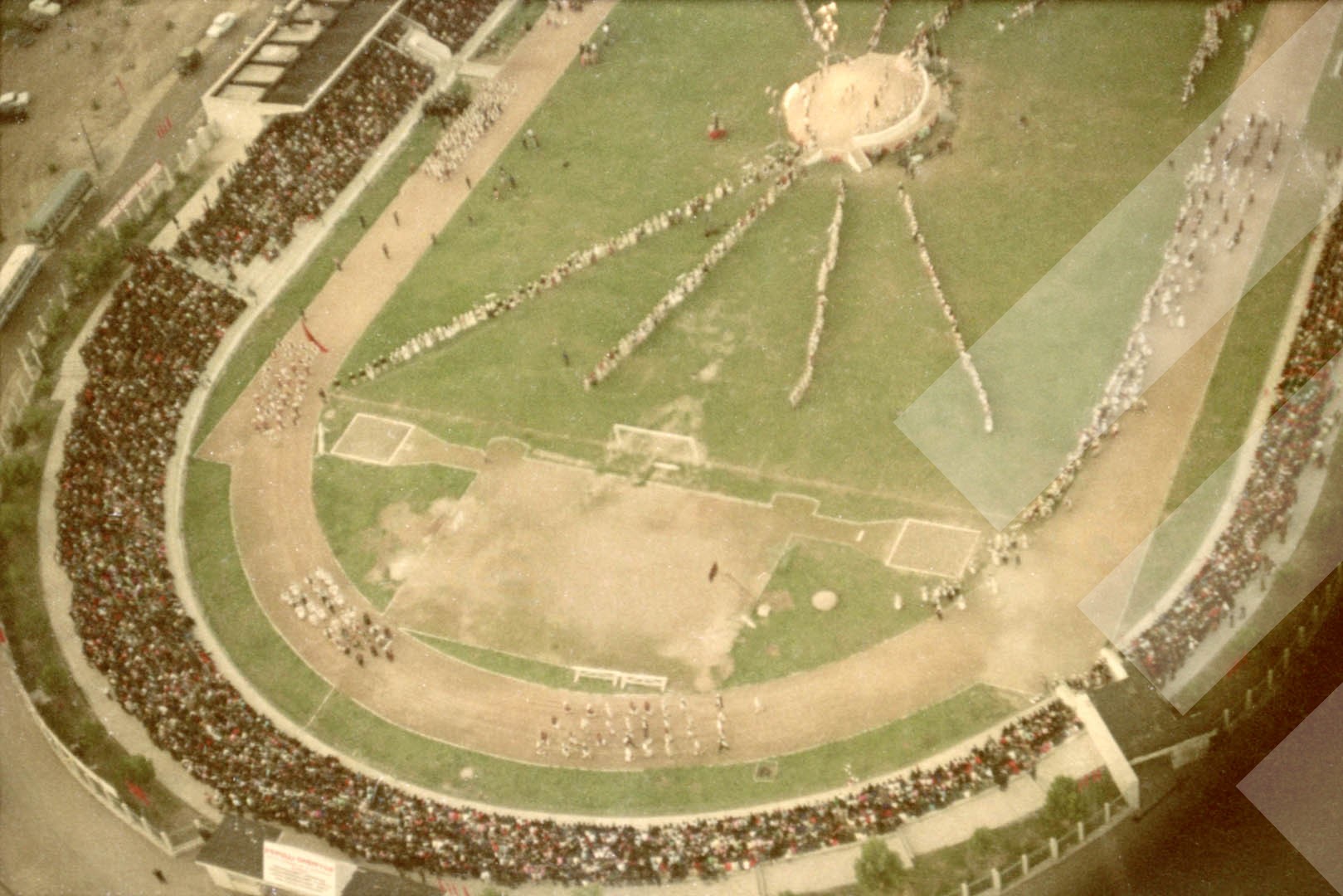 Petrit Ristani, 1982, Pamje nga helikopteri e një manifestimi në stadium, negativ,, 35 mm.