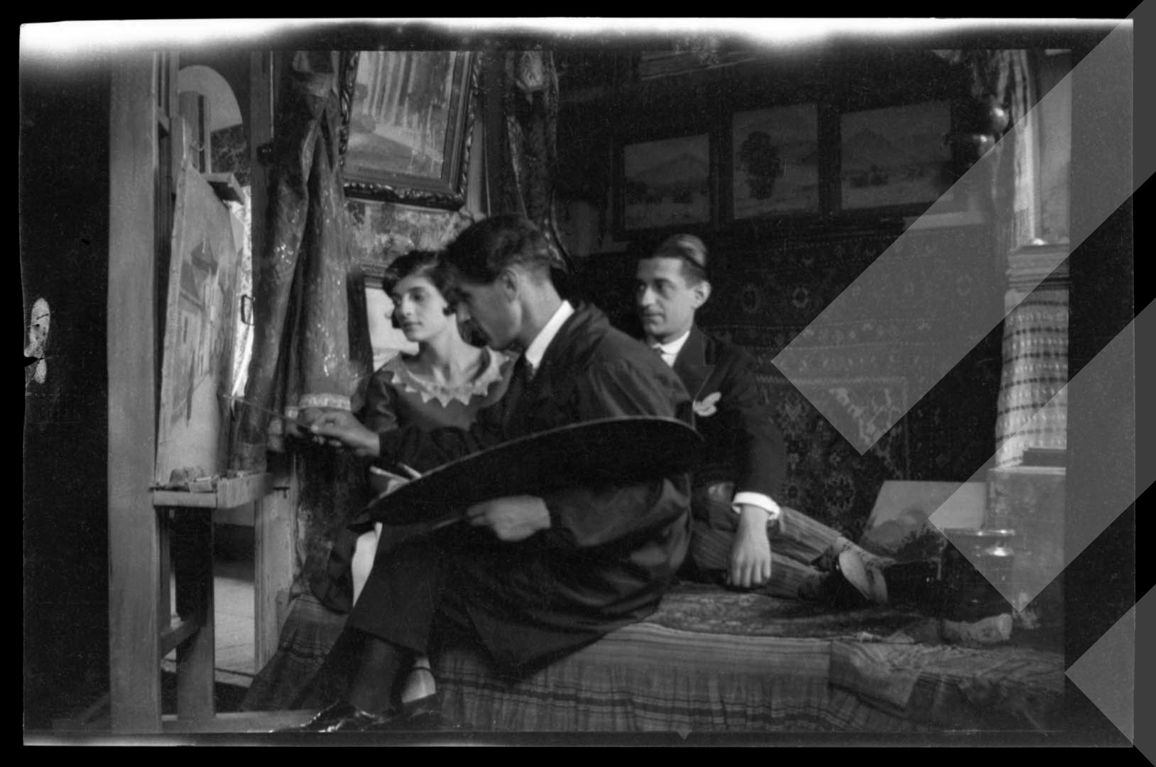 Vangjush Mio , "", rreth 1930-1935 , , Mio në studio me familjarë , , negativ , 6 x 9 cm