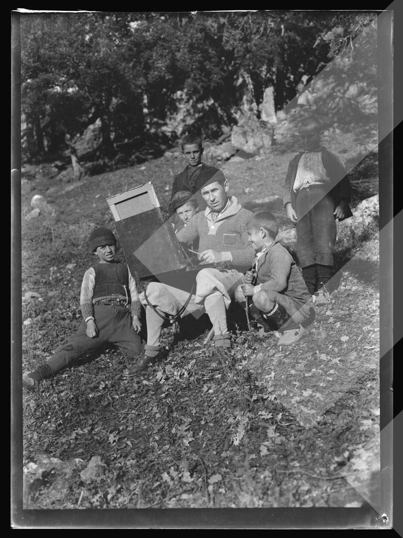Vangjush Mio , "", rreth 1930-1935 , , Piktori Vangjush Mio i rrethuar nga kureshtarë të vegjël , , pllakë xhami , 9 x 12 cm
