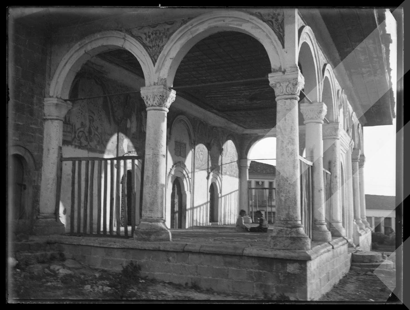 Vangjush Mio , "", rreth 1930-1935 , , Portiku i Xhamisë së Abdurrahman Pashës në Peqin , , pllakë xhami , 9 x 12 cm