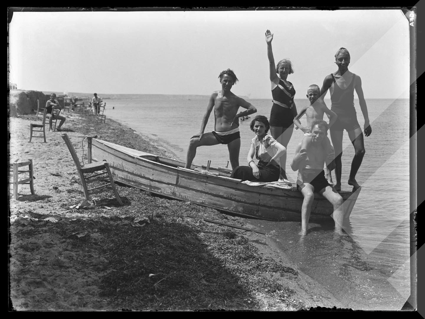 Vangjush Mio , "", rreth 1930-1935 , , Çifti Mio (majtas) në plazh me miq , , pllakë xhami , 9 x 12 cm