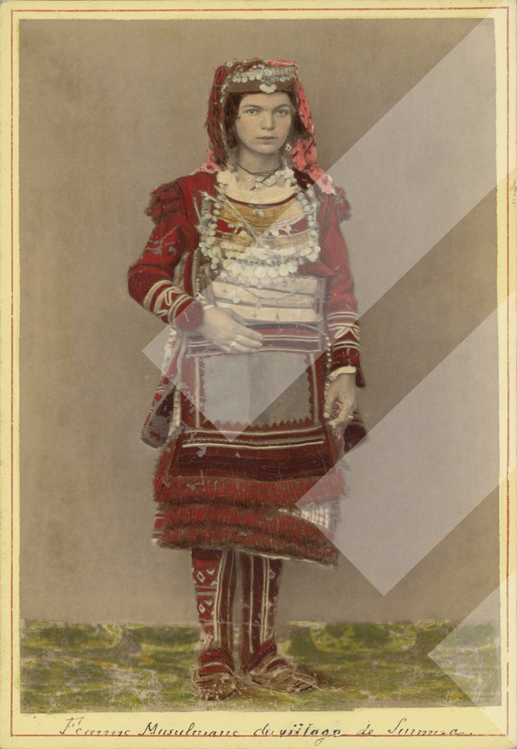 Pjetër Marubi, rreth 1865-1875, grua myslimane nga Luma, print në letër i ngjyrosur me dorë, 10 x 14.5 cm.
