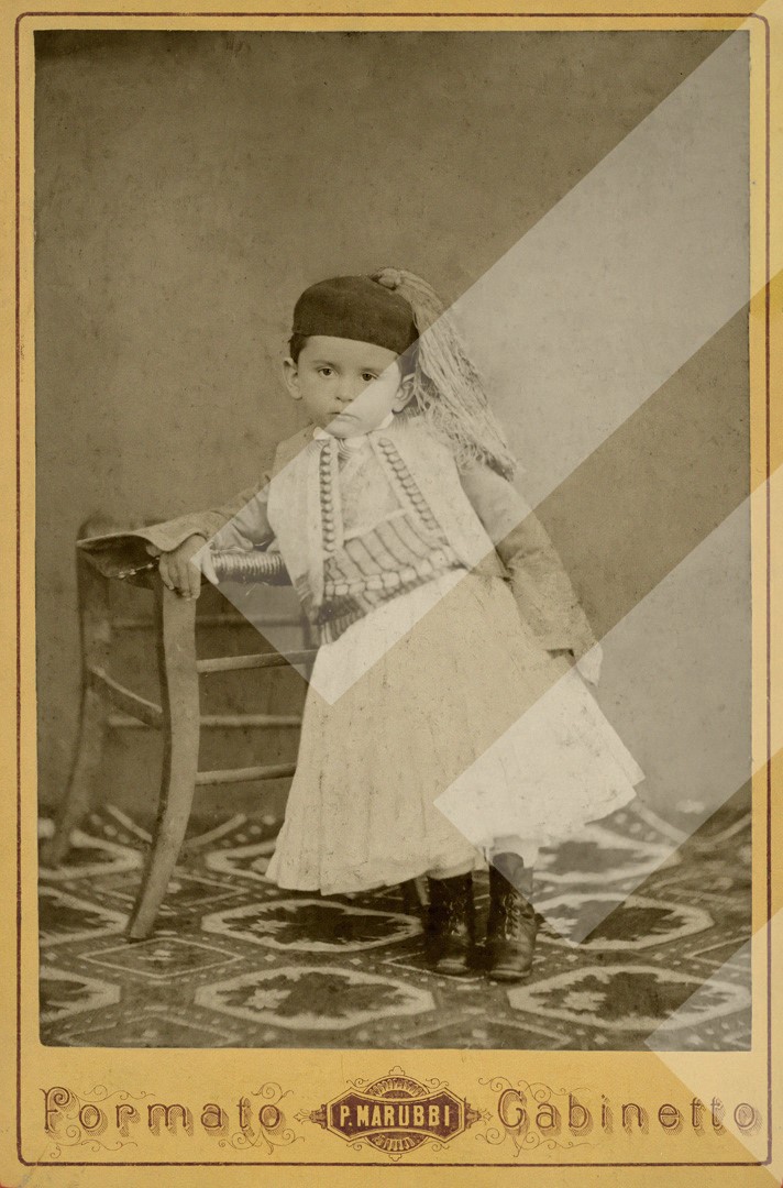 Pjetër Marubi, rreth 1870-1880, fëmijë mysliman në studio, print në albuminë, 10 x 14 cm.