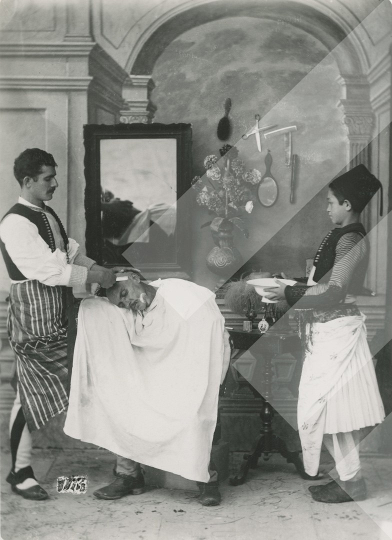 Kel Marubi, rreth 1900-1910, Berber dhe çirak duke pozuar në studio print në letër, 12 x 18 cm.