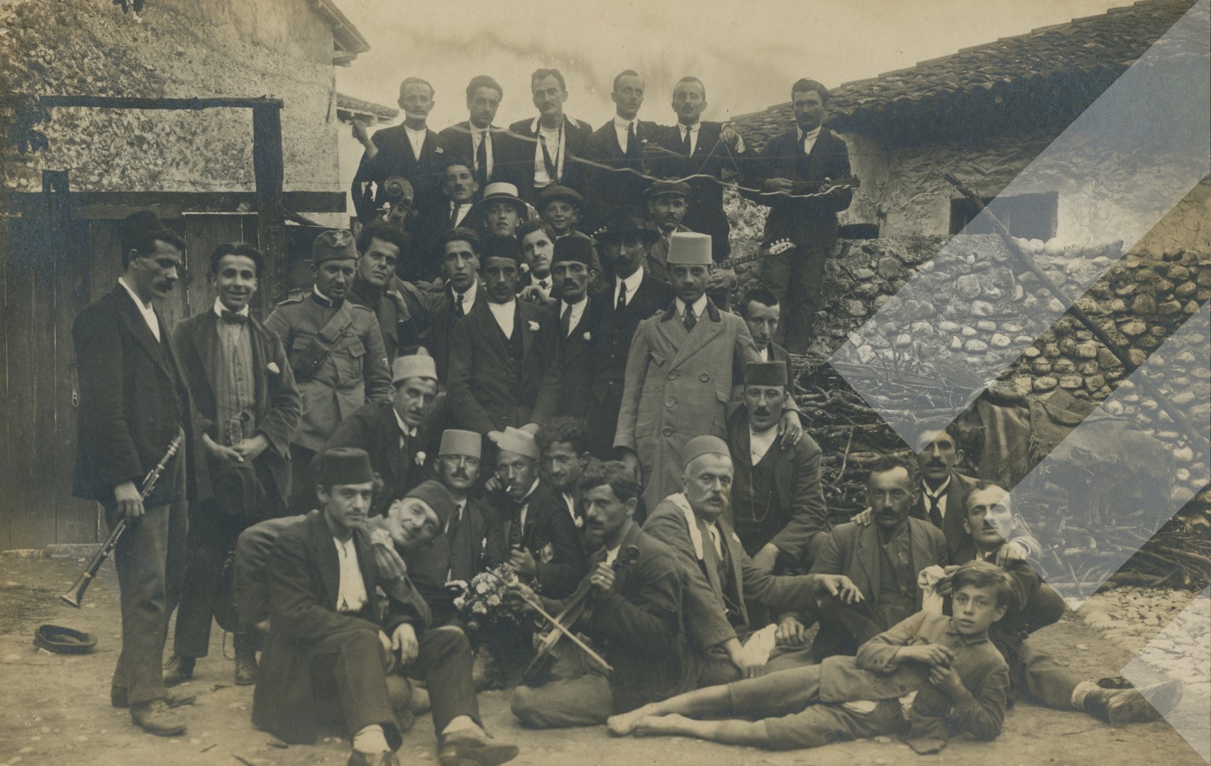 Kel Marubi, rreth 1925-1930 Grup muzikor mes të cilëve dhe fotografi Kel Marubi print në letër, 9 x 14 cm.