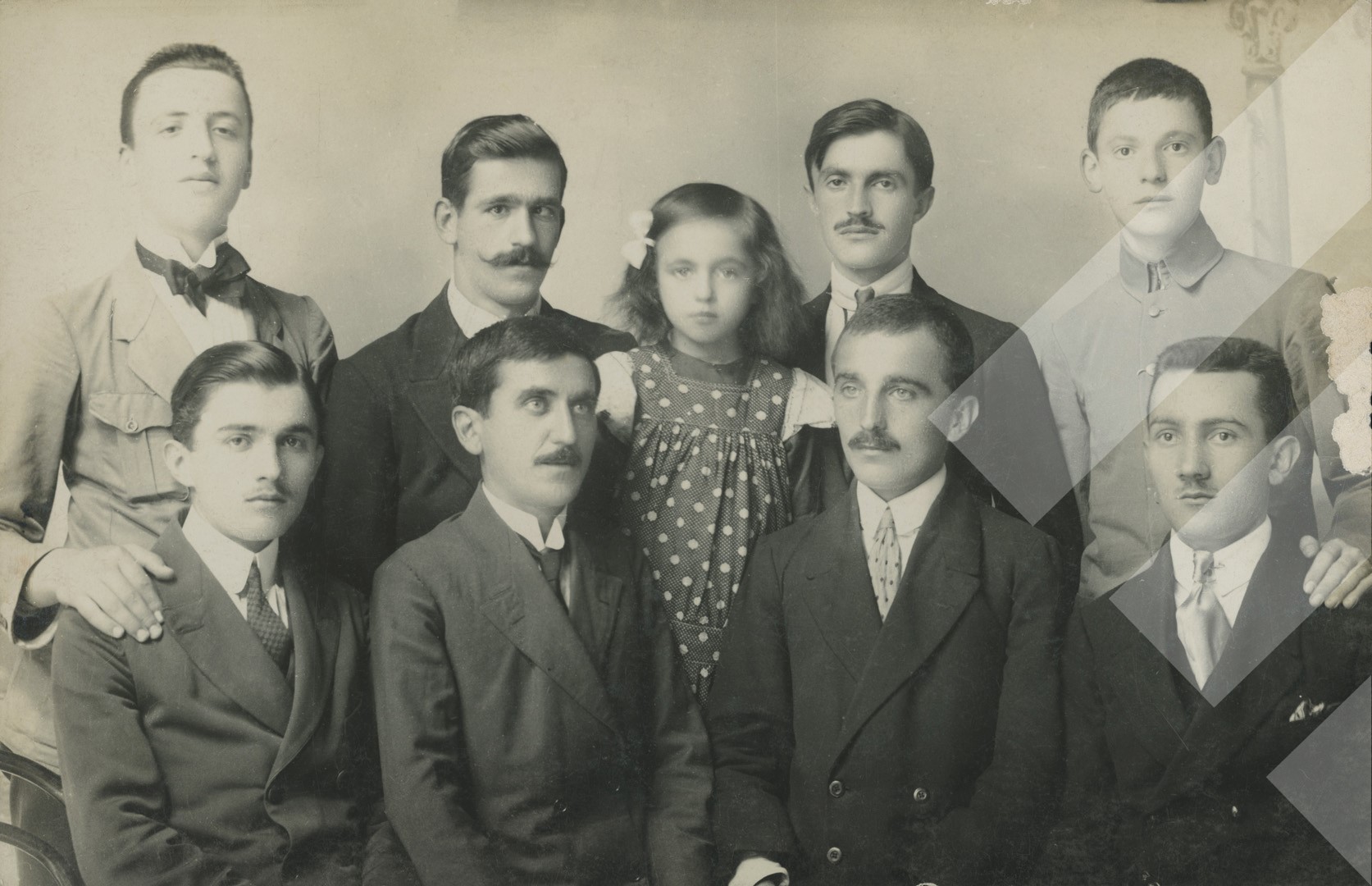 Kel Marubi, rreth 1920-1930 Foto grupi në studio, Shkodër print në letër, 9 x 14 cm.