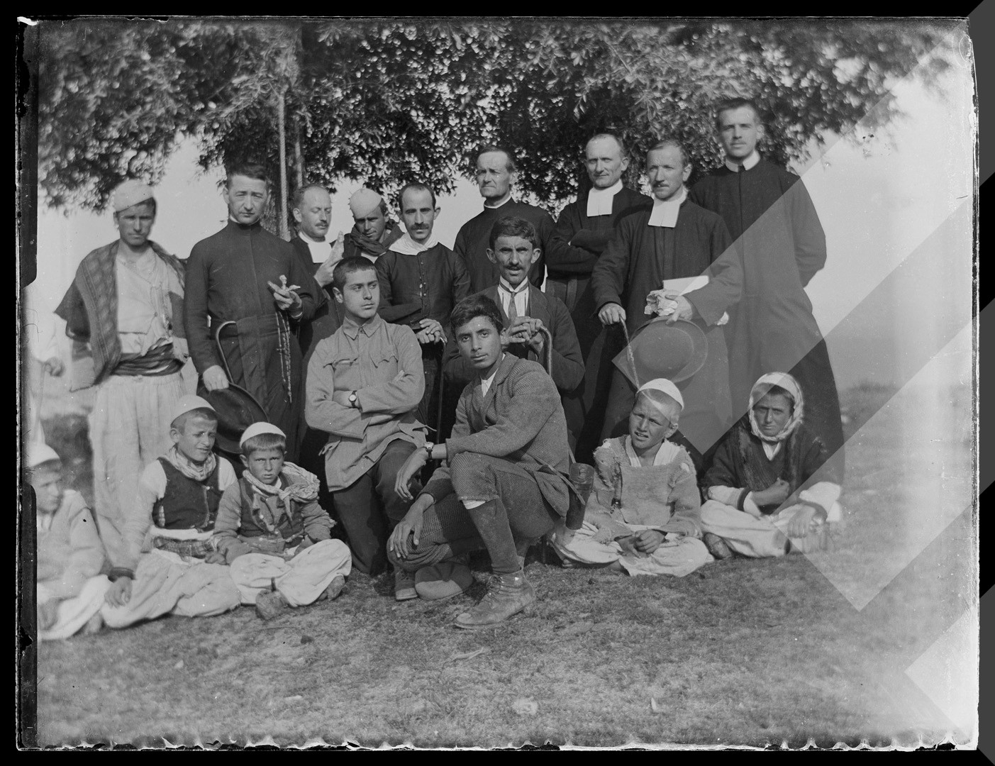 I panjohur, rreth 1915-1917 Klerikë dhe të rinj malësorë pllakë xhami, 9 x 12 cm.