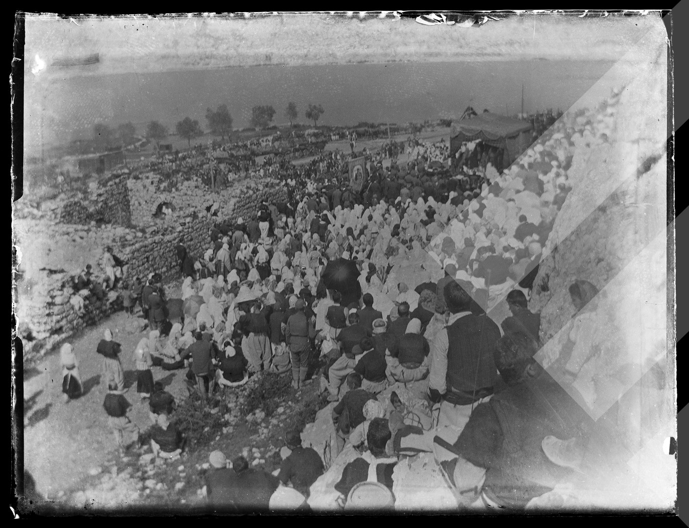 I panjohur, rreth 1900-1910 Malësorë në procesion fetar pllakë xhami, 8 x 10 cm.