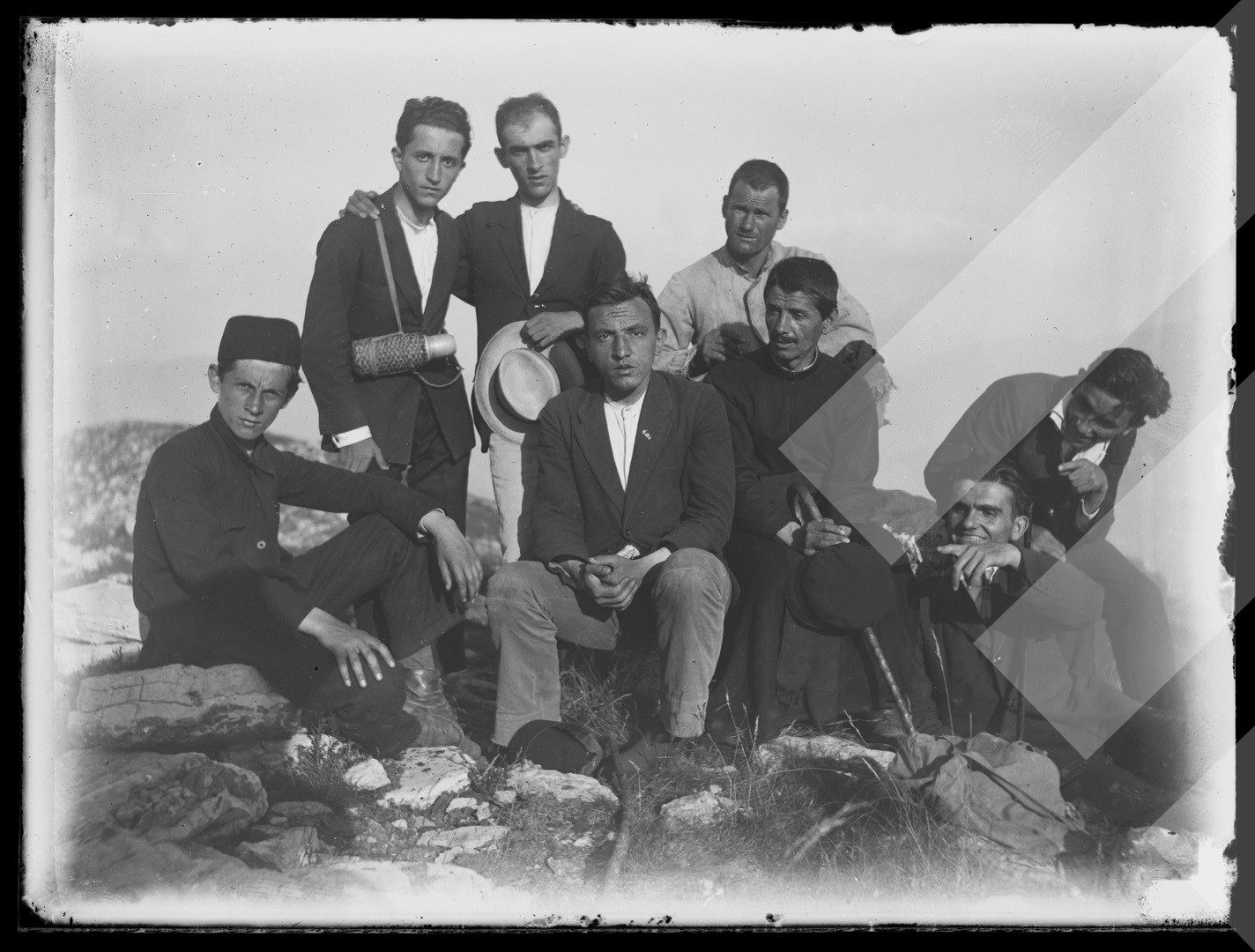 I panjohur, rreth 1930 Një grup të rinjsh me famullitarin në një fshat verior pllakë xhami, 9 x 12 cm.
