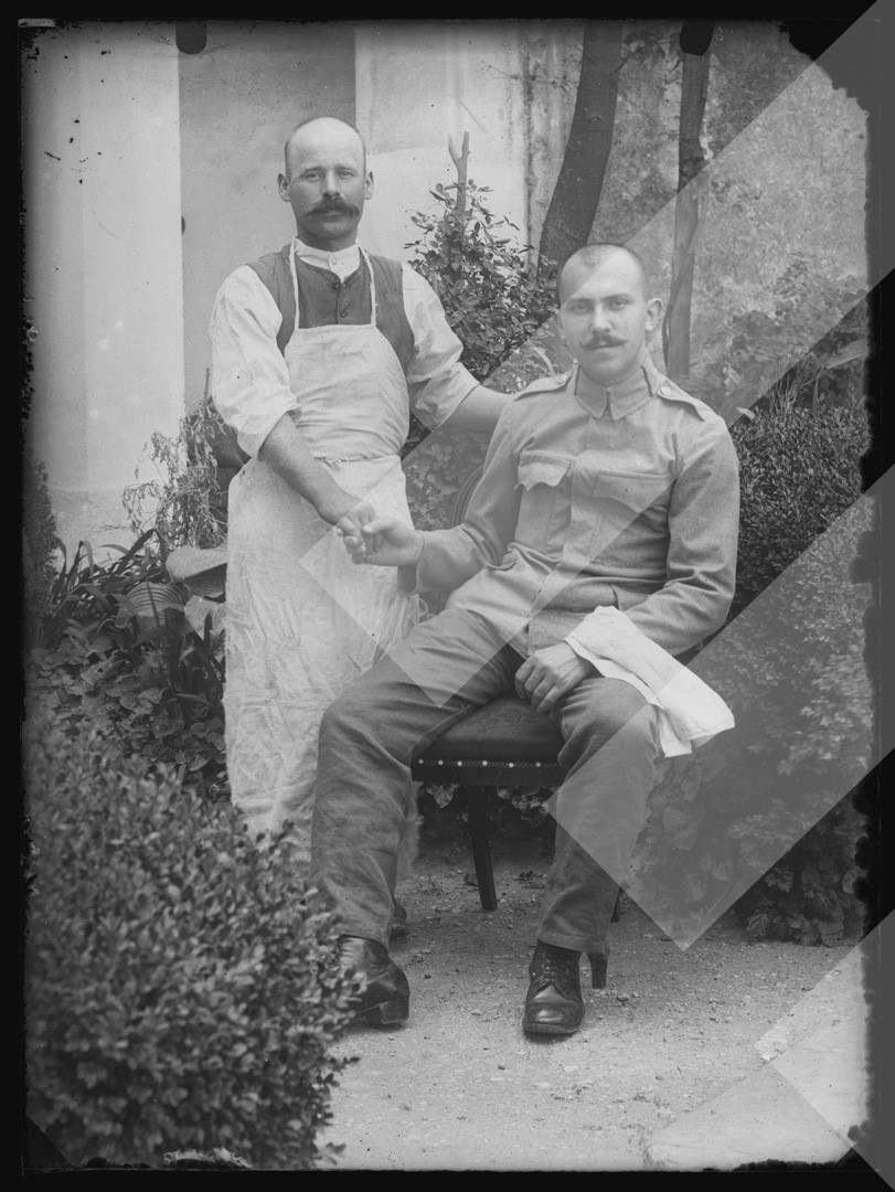 I panjohur, rreth 1915-1917 Ushtar austro-hungarez duke përgëzuar kuzhinierin e mensës, Shkodër pllakë xhami, 9 x 12 cm.