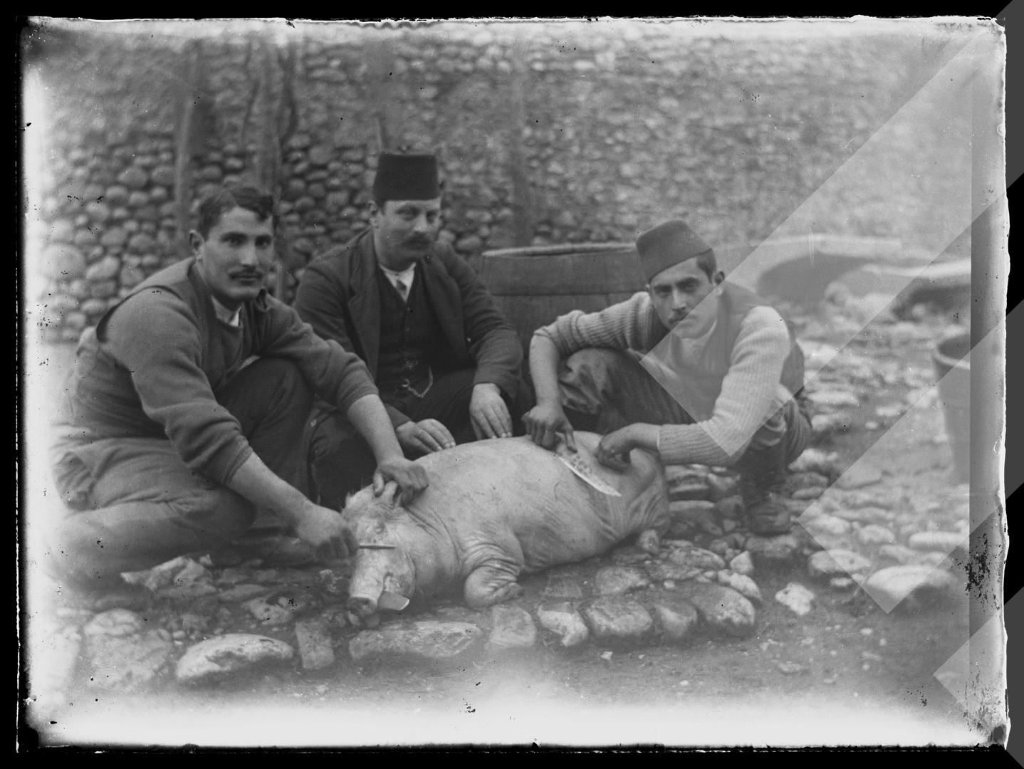 I panjohur rreth 1915-1917 Përgatitja e derrit për ushtarët austro-hungarezë , Shkodër pllakë xhami, 9 x 12 cm.