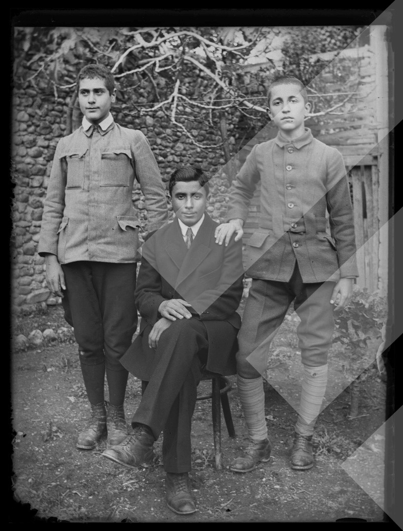 I panjohur rreth 1915-1917 Tre të rinj në pozë, Shkodër pllakë xhami, 9 x 12 cm.