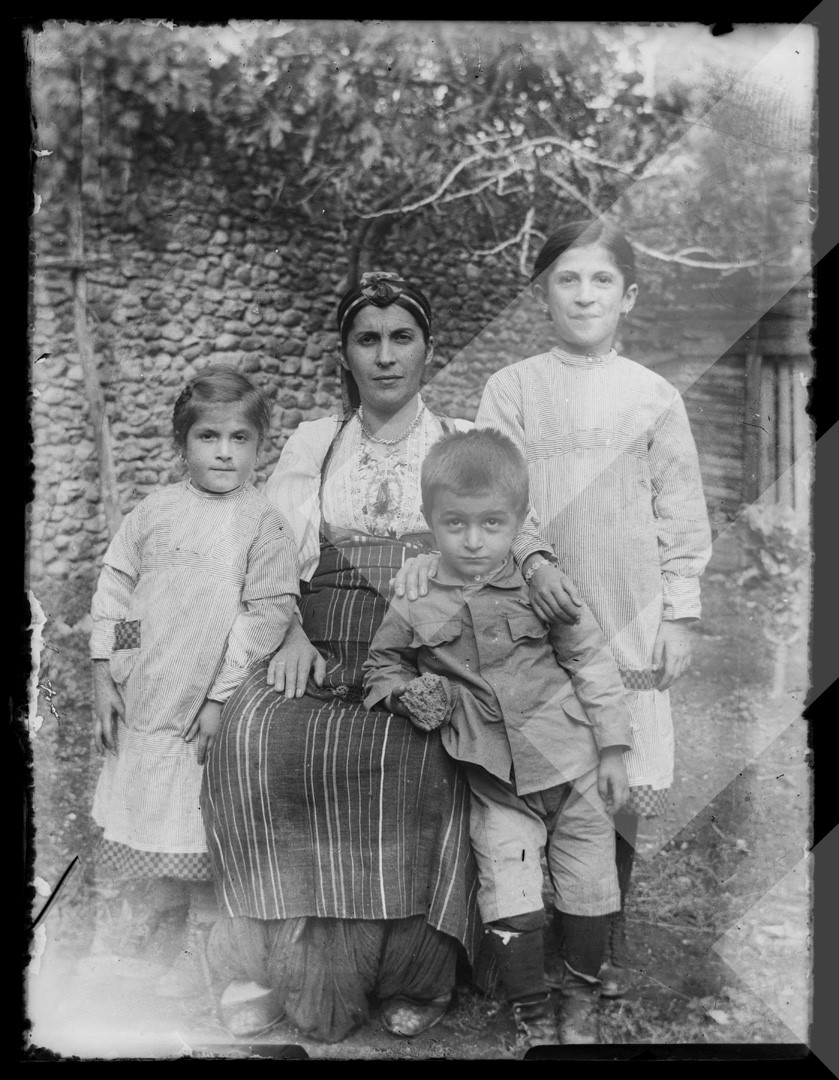 I panjohur rreth 1930-1935 Familje në kopësht, Shkodër pllakë xhami, 8 x 10 cm.