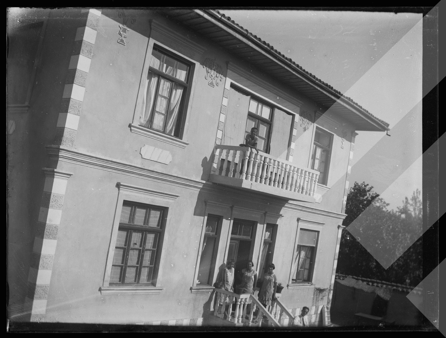 I panjohur rreth 1930 Familje në pozë para shtëpisë së tyre, Shkodër pllakë xhami, 9 x 12 cm.