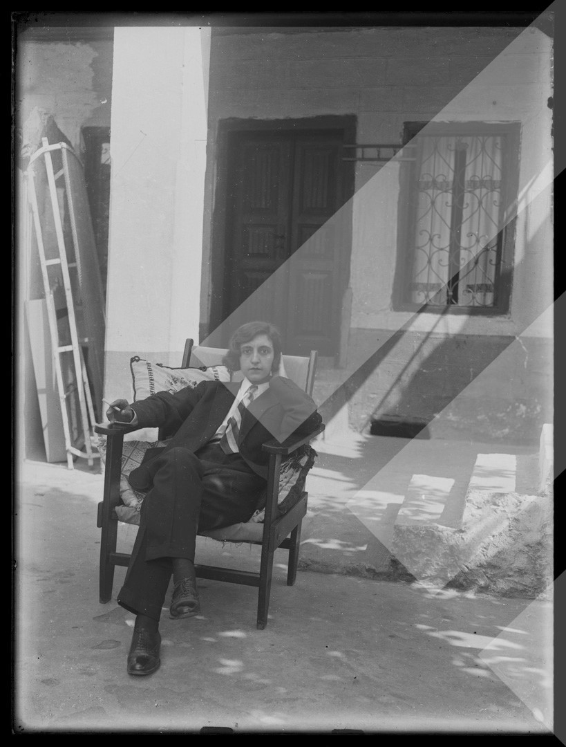 I panjohur rreth 1930 Një e re e veshur me kostum burri, Shkodër pllakë xhami, 9 x 12 cm.