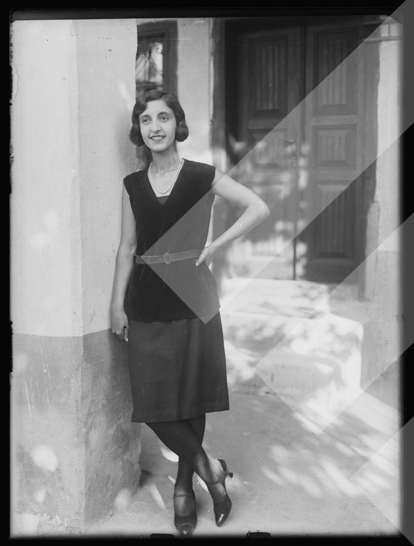 I panjohur rreth 1930 Vajzë në pozë para shtëpisë, Shkodër pllakë xhami, 9 x 12 cm.