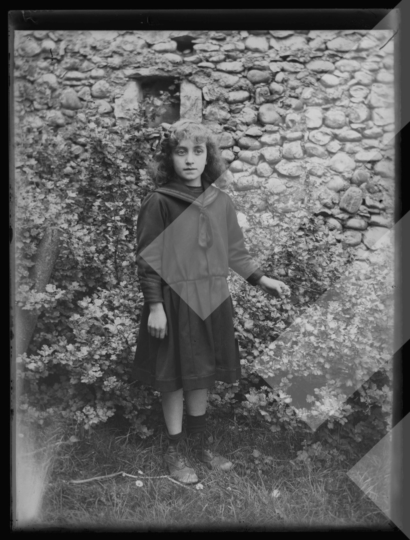 I panjohur rreth 1930-1935 Vajzë në oborrin e shtëpisë, Shkodër pllakë xhami, 9 x 12 cm.