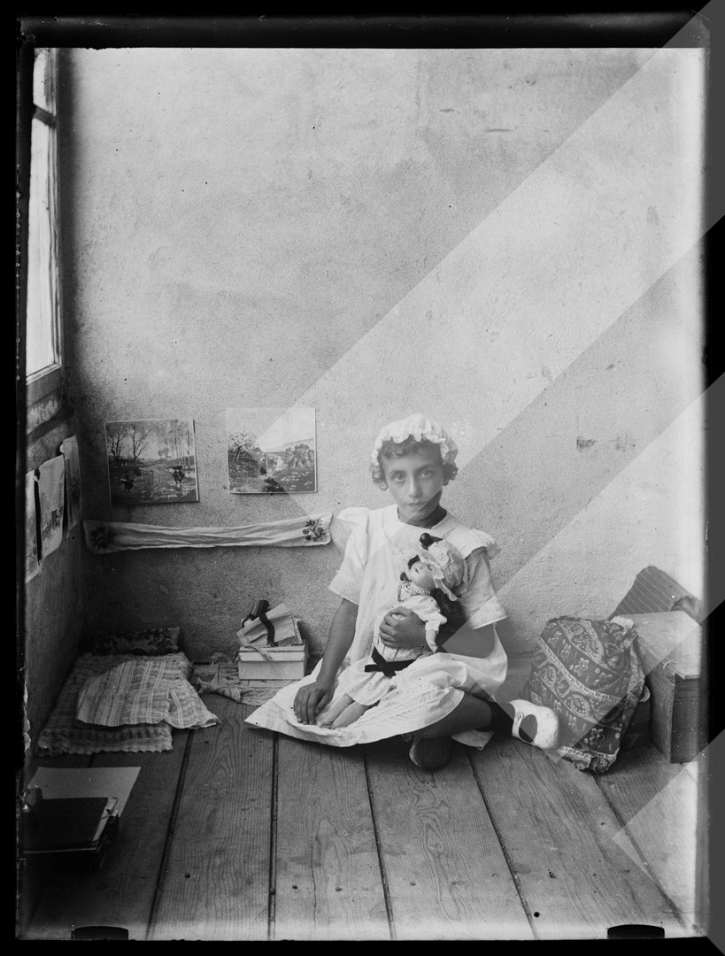 I panjohur rreth 1930 Një vajzë në kendin e saj të lojës, Shkodër pllakë xhami, 9 x 12 cm.