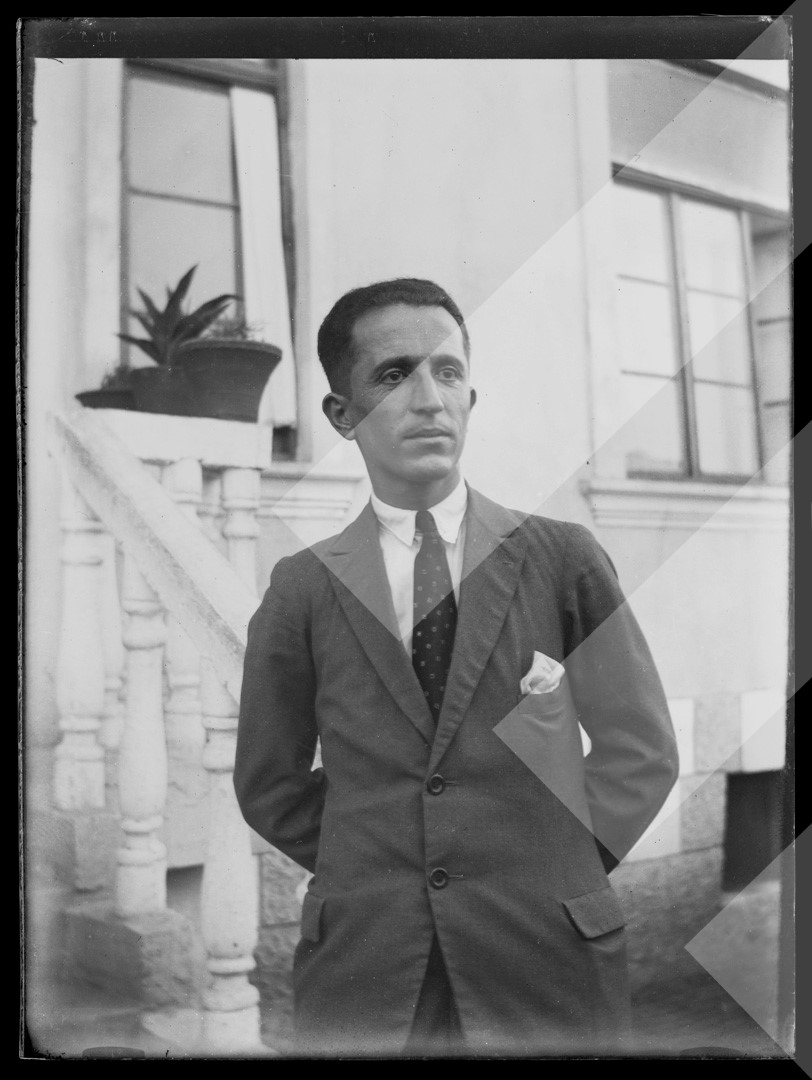 I panjohur rreth 1930-1935 Burrë përpara shtëpisë, Shkodër pllakë xhami, 9 x 12 cm.
