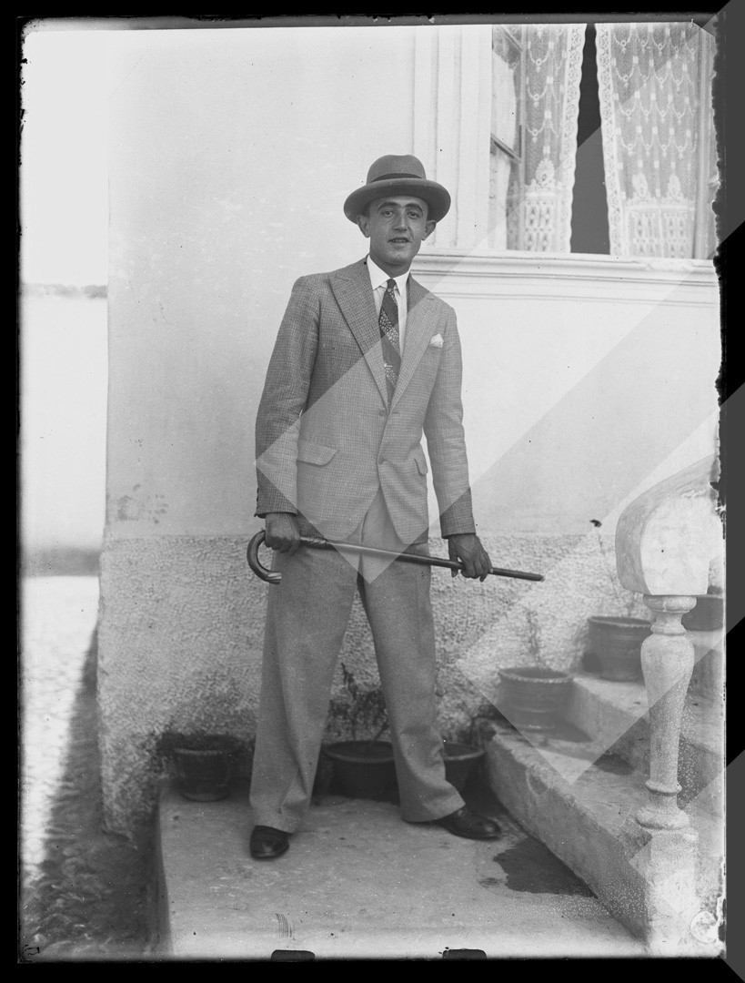 I panjohur rreth 1930 I ri në pozë para shtëpisë, Shkodër pllakë xhami, 9 x 12 cm.