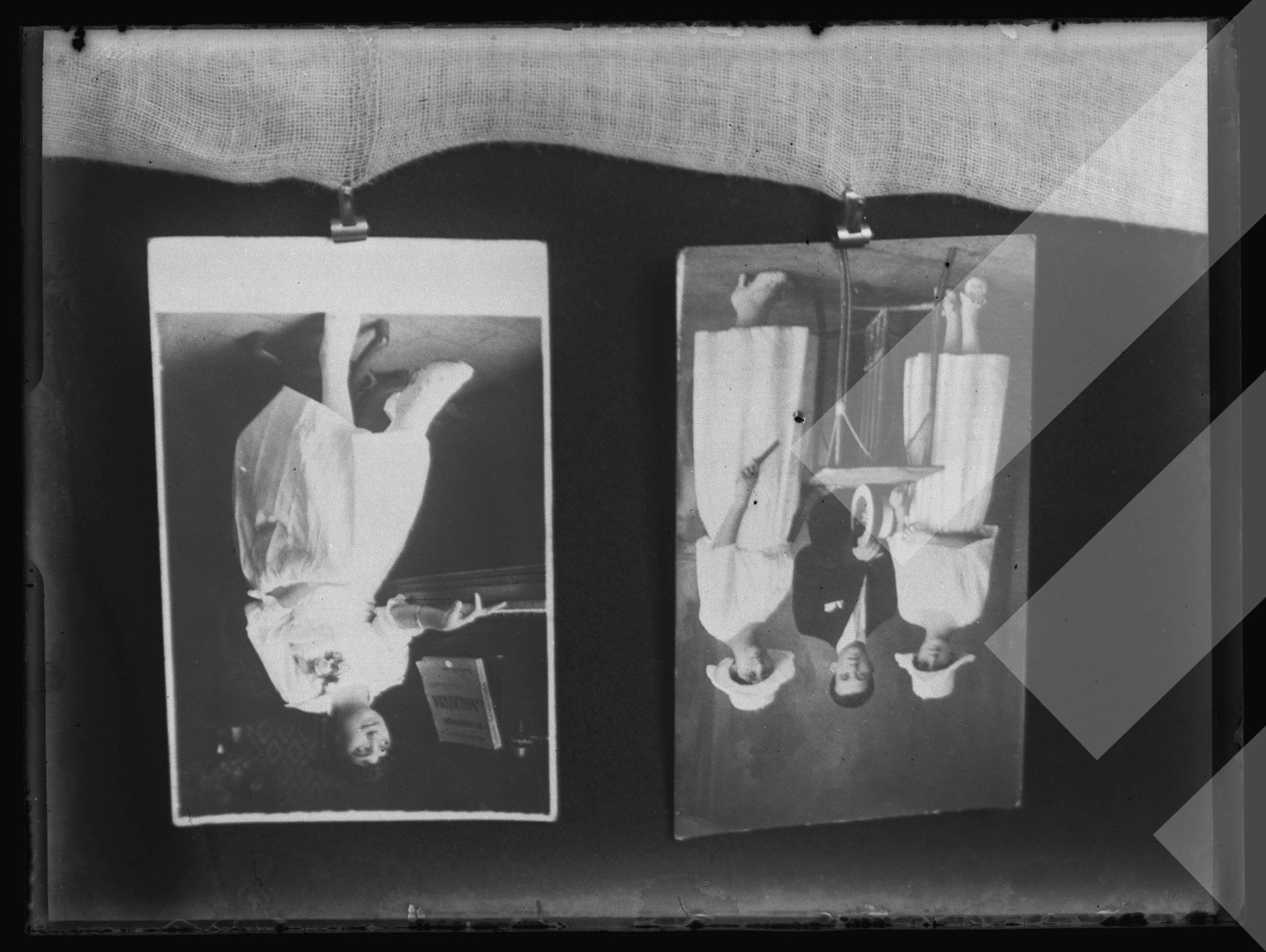 I panjohur rreth 1930-1935 Dy foto të sapodala nga vaska e fiksimit pllakë xhami, 9 x 12 cm.