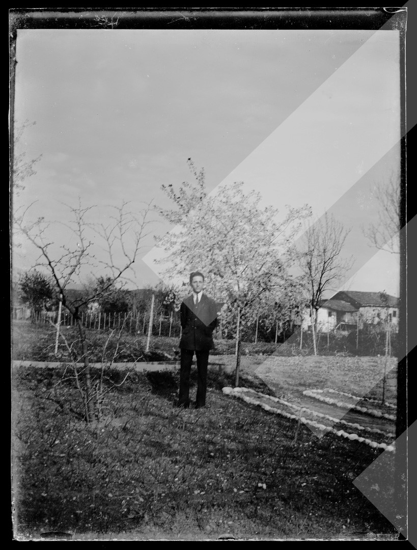 I panjohur rreth 1930-1935 Burrë në kopshtin e shtëpisë, Shkodër pllakë xhami, 9 x 12 cm.
