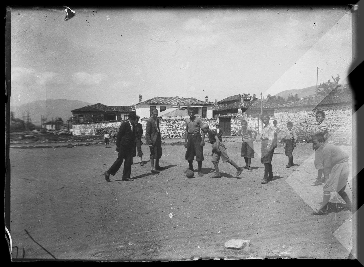 I panjohur rreth 1930-1935 Femijë duke luajtur futboll, Korçë pllakë xhami, 9 x 12 cm.