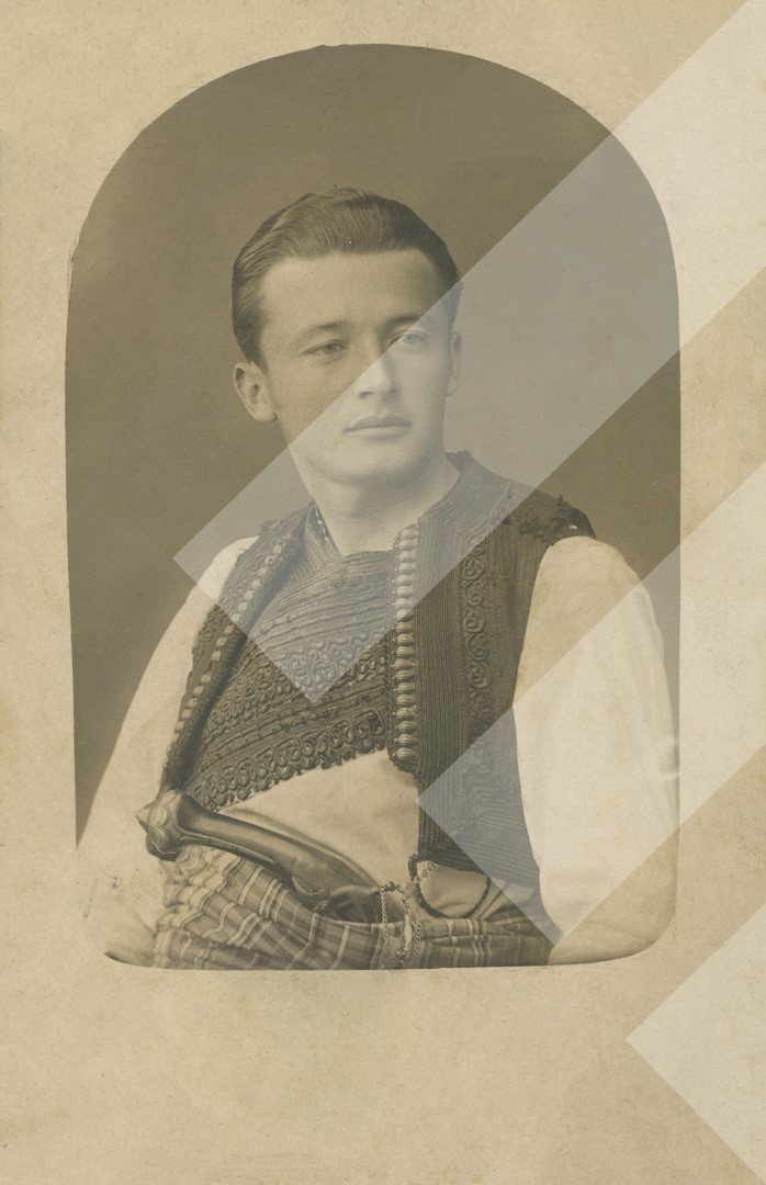 I panjohur rreth 1900-1905 Burrë me veshje kombëtare print në letër, 9 x 14 cm.
