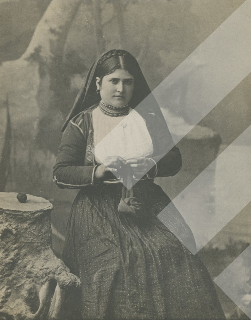 I panjohur, rreth 1900-1910 Grua në pozë duke qëndisur print në letër, 8 x 9 cm.