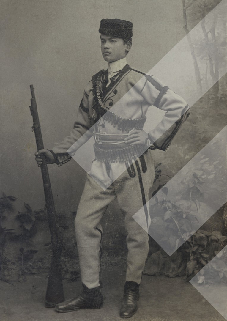 I panjohur, rreth 1905-1910 Djalosh me armë në pozë print në letër, 10 x 14 cm.